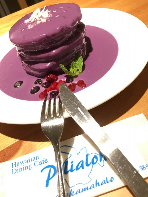 紫芋のソースをたっぷりかけたHawaiiでも人気のあるパンケーキ^_^甘いものが苦手な方でも食べやすいと好評です!